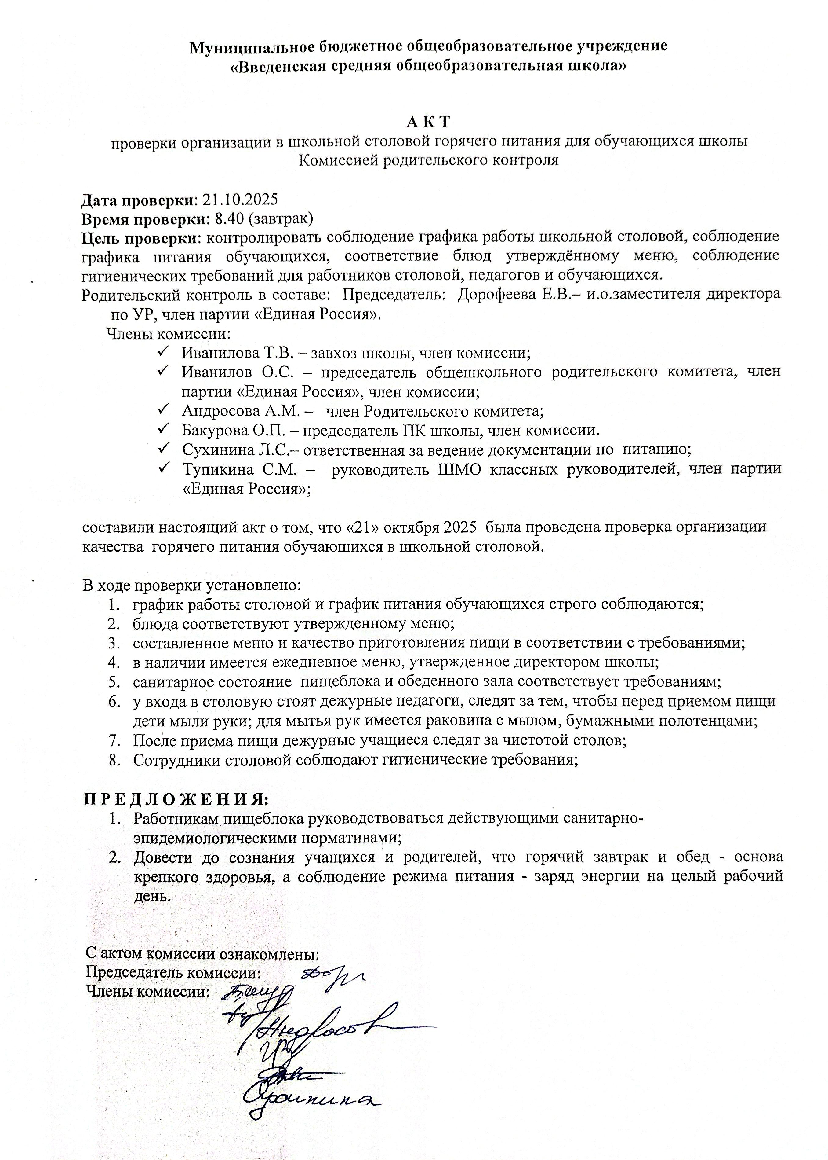 Акты проверки организации горячего питания: акт №1