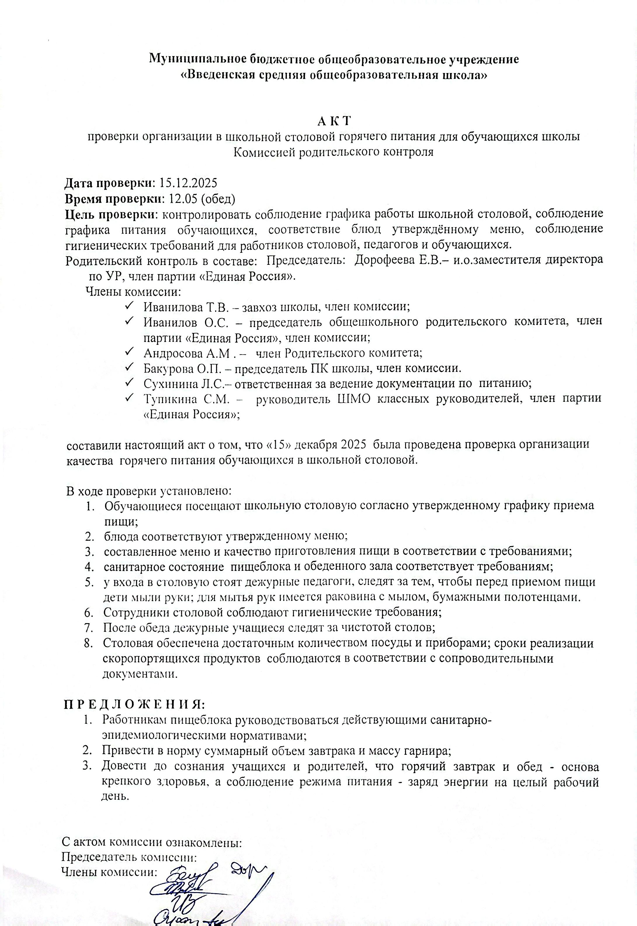 Приказ о создании комиссии по осуществлению контроля за качеством питания обучающихся в школьной столовой в 2025-2026 учебном году
